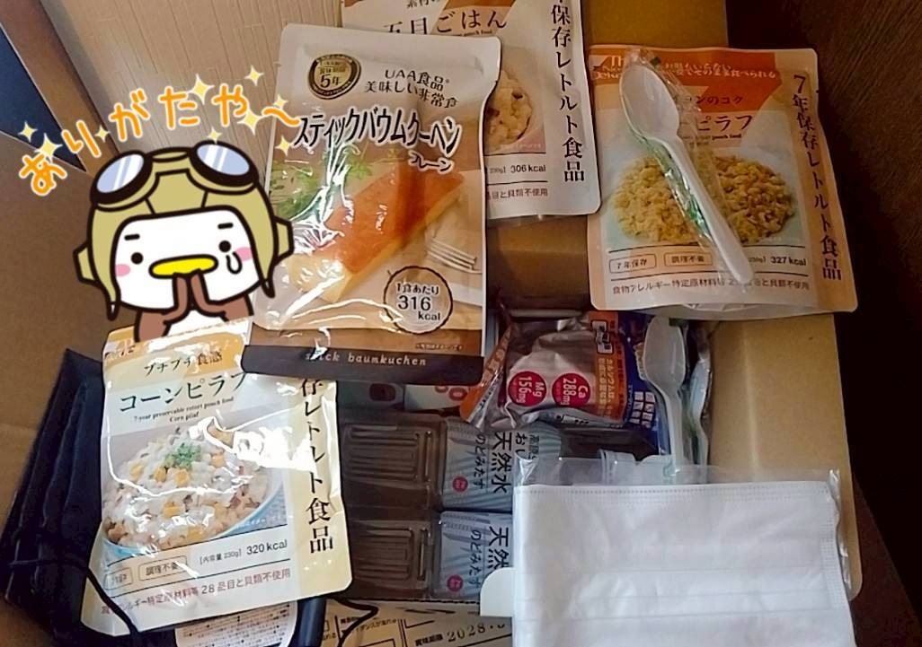 飲料水、レトルト食品(カレーピラフ等)、栄養機能食品、レスキューシート、衛生用品などがセットになった、非常に充実した内容です。
