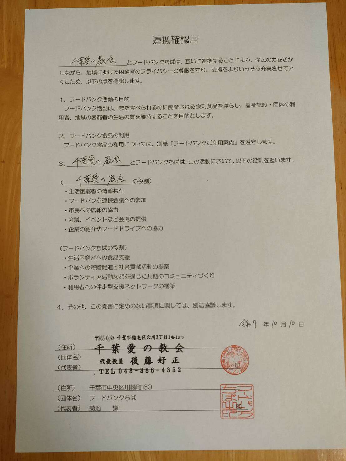 令和7年10月10日、千葉愛の教会とフードバンクちばとは、互いに連携することにより、住民の力を活かしながら、地域における困窮者のプライバシーと尊厳を守り、支援をいっそう充実させるため、連携確認書を取り交わしました。